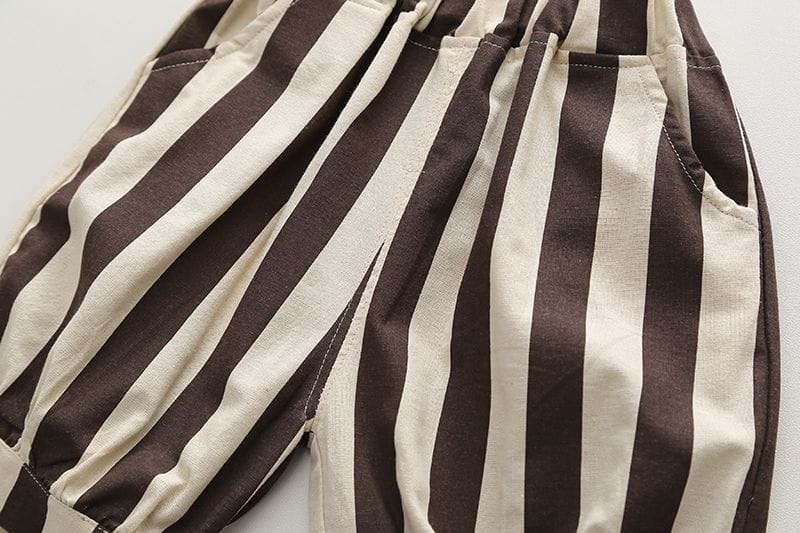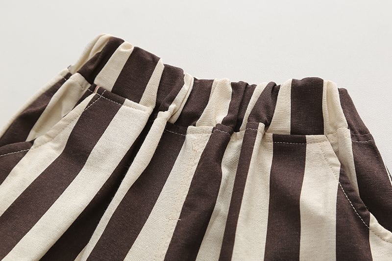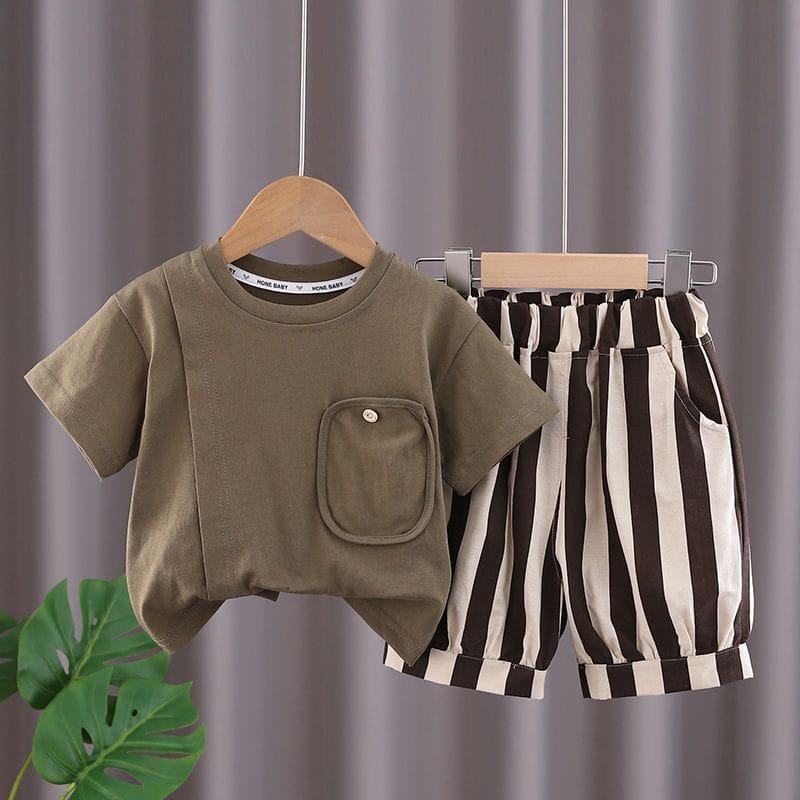 “description”: “Breathable cotton 2-piece kids set with a pocket tee and elastic striped shorts. Comfortable, stylish and easy-care.”,
