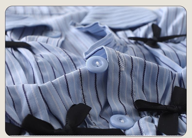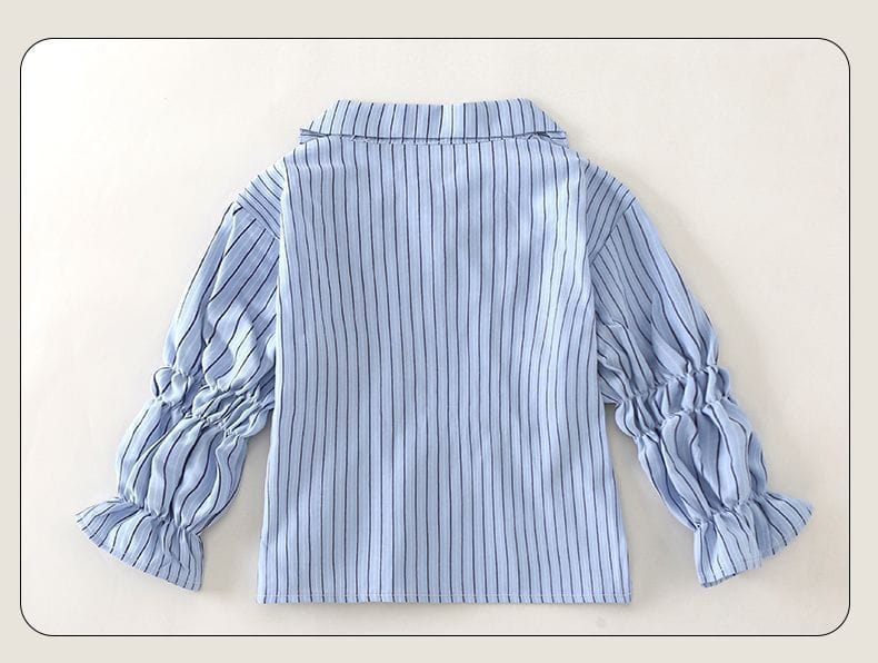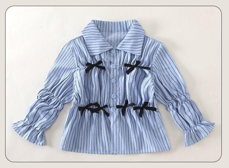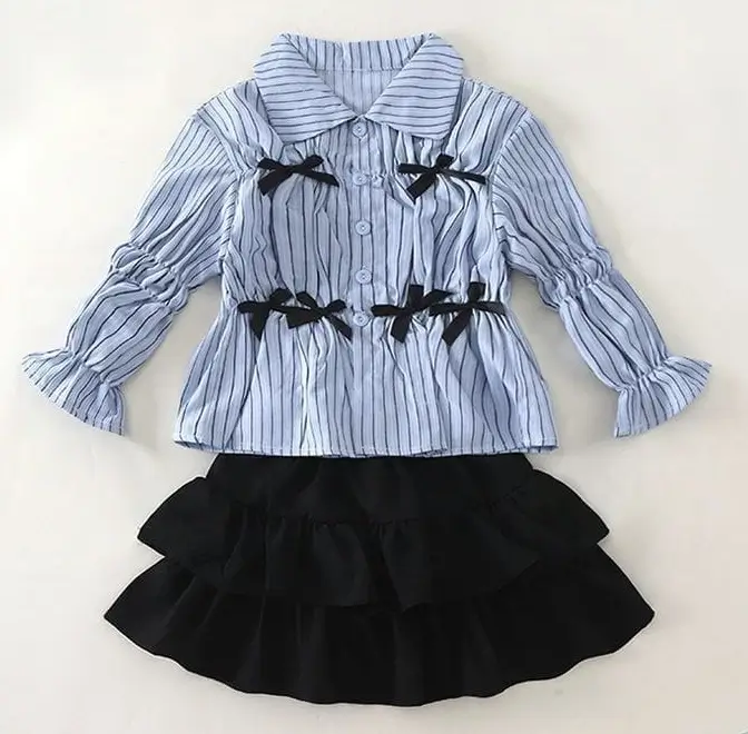 Chic and classy, the Striped Elegance Bow Set is designed for little fashion lovers who adore style with comfort. The outfit includes a blue striped shirt detailed with adorable black bows, paired with a layered black frill skirt that adds a touch of playful sophistication.