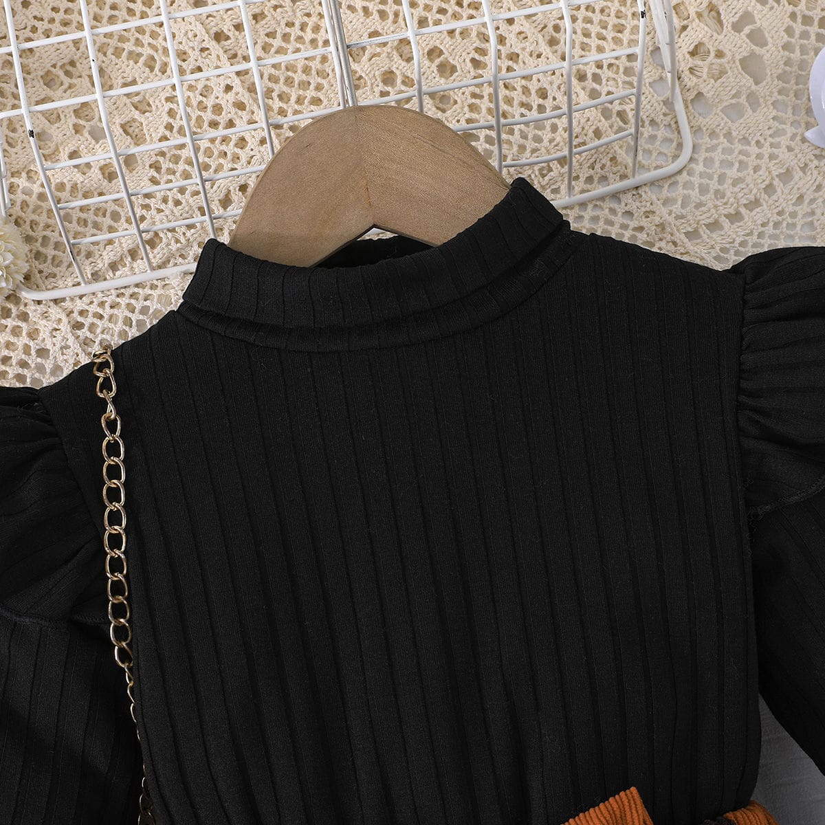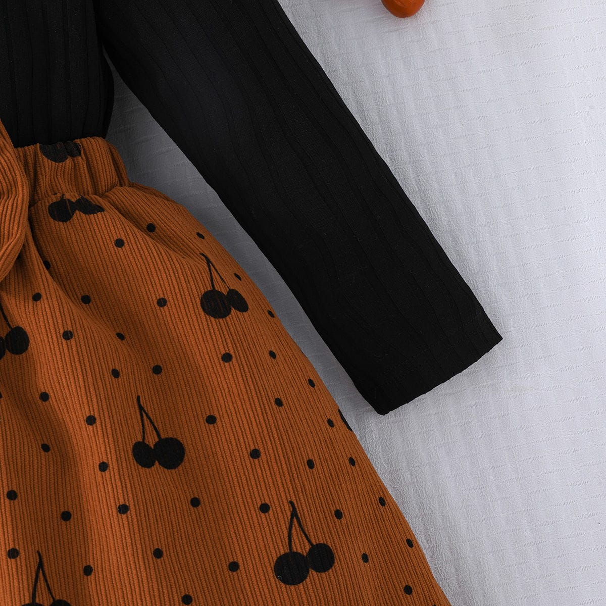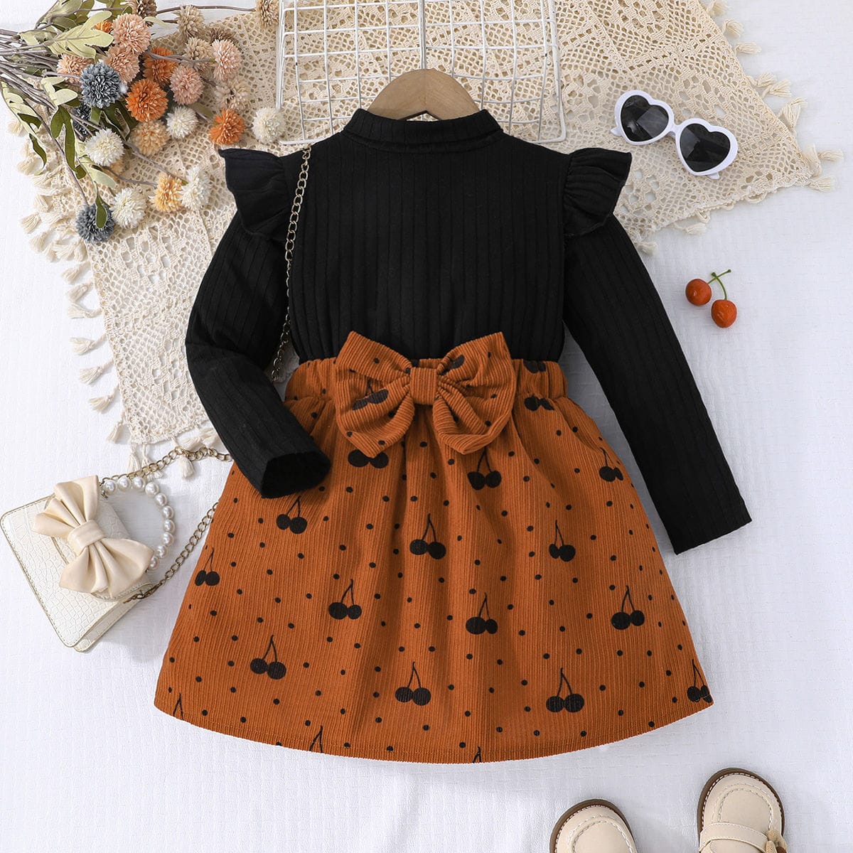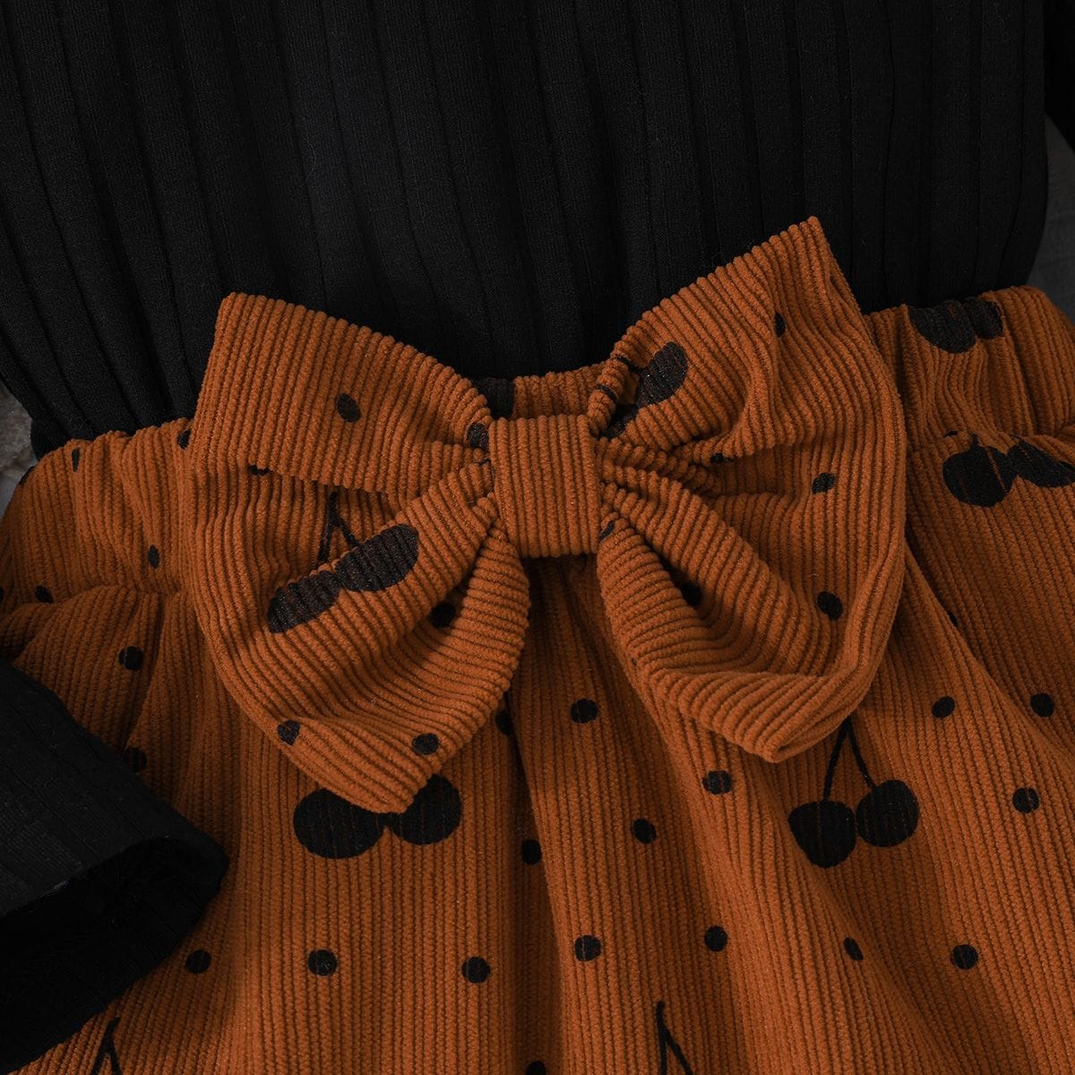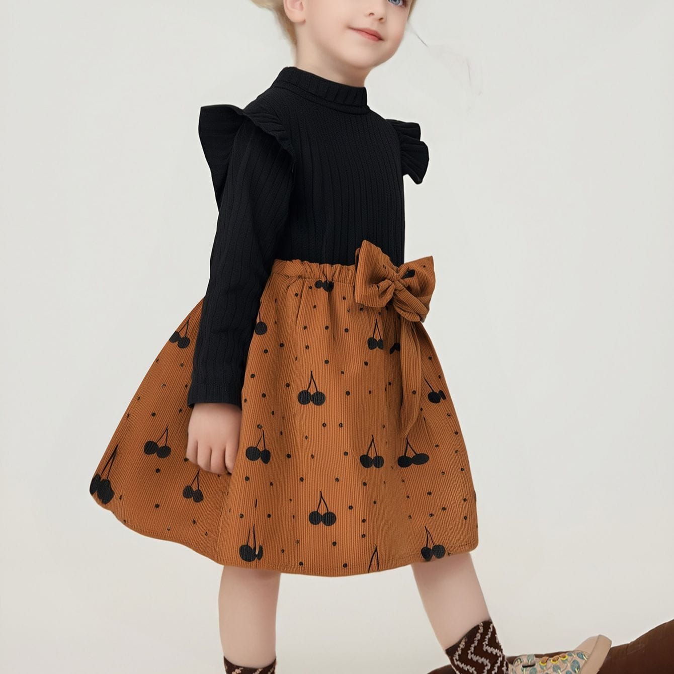 Elegant, stylish, and playful — the Cherry Charm 2-Piece Skirt Dress is the perfect outfit for your little fashionista. The set features a chic black ribbed top with flutter sleeves, paired with a soft brown corduroy skirt printed with cute cherry patterns. A matching bow adds the sweetest finishing touch.