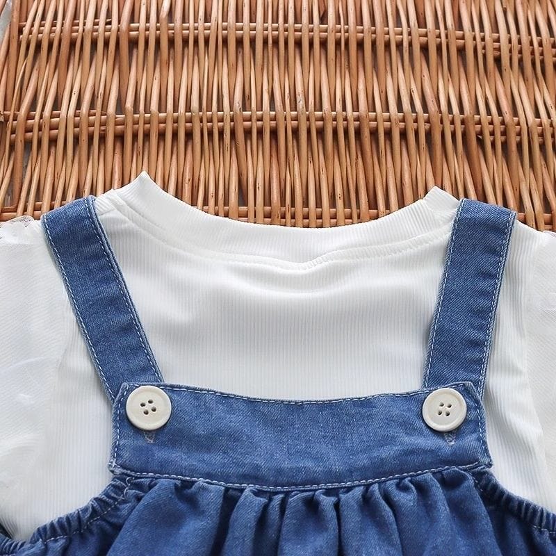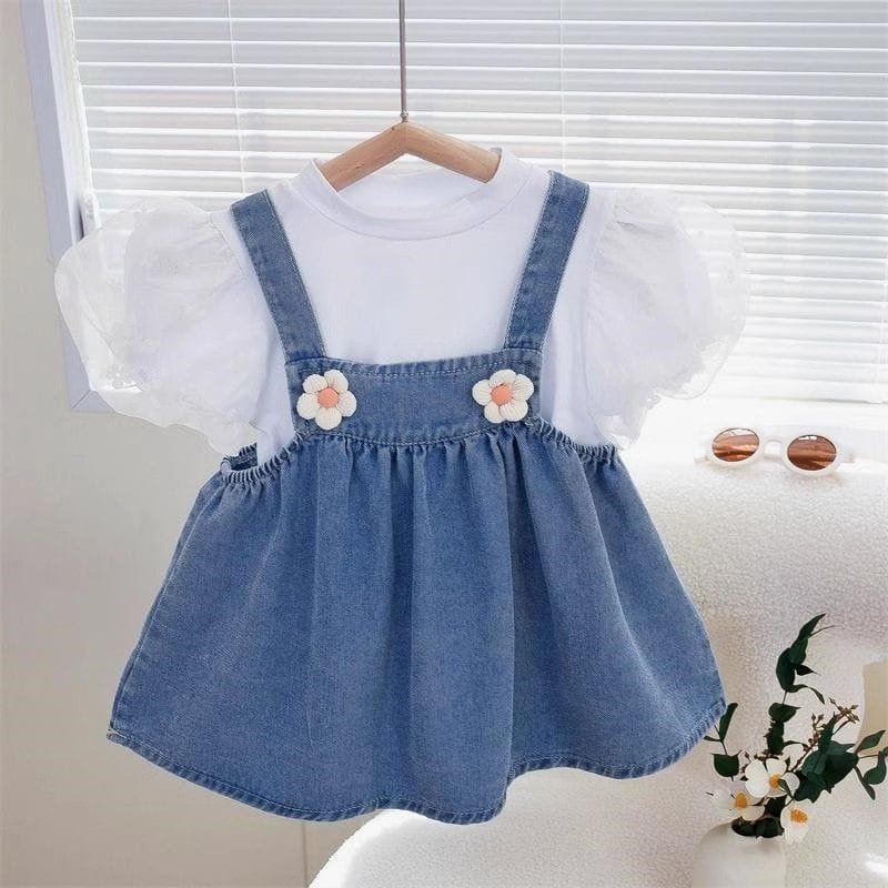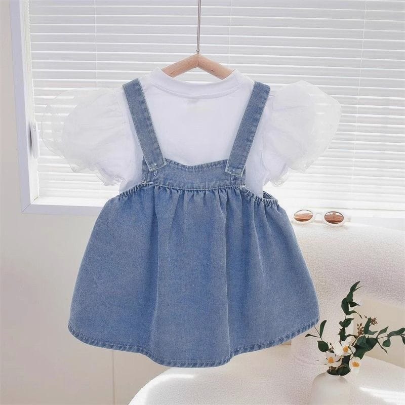 - 2-piece outfit: white puff-sleeve top with denim frock