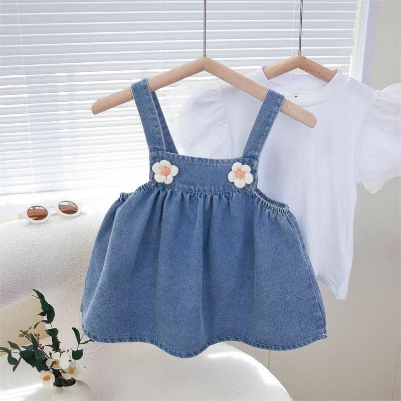 The Denim Blossom Strap Frock combines style and comfort with a dash of floral charm — a must-have outfit for your little fashionista!