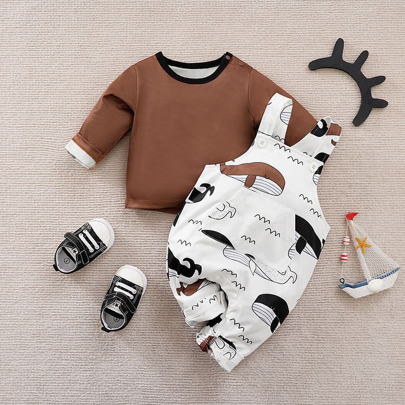 Stylish, comfy, and playful — the Little Explorer 2-Piece Romper Set is perfect for your newborn’s everyday adventures. This set includes a soft brown long-sleeve shirt and a cute white romper with whale prints, creating a trendy yet adorable look.