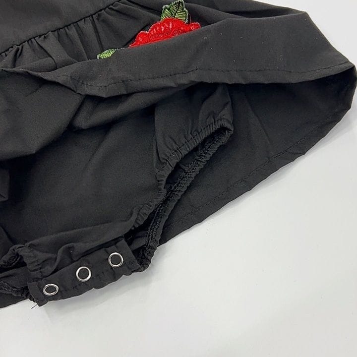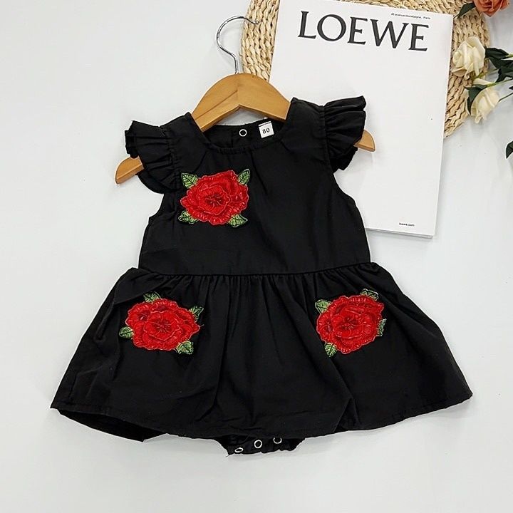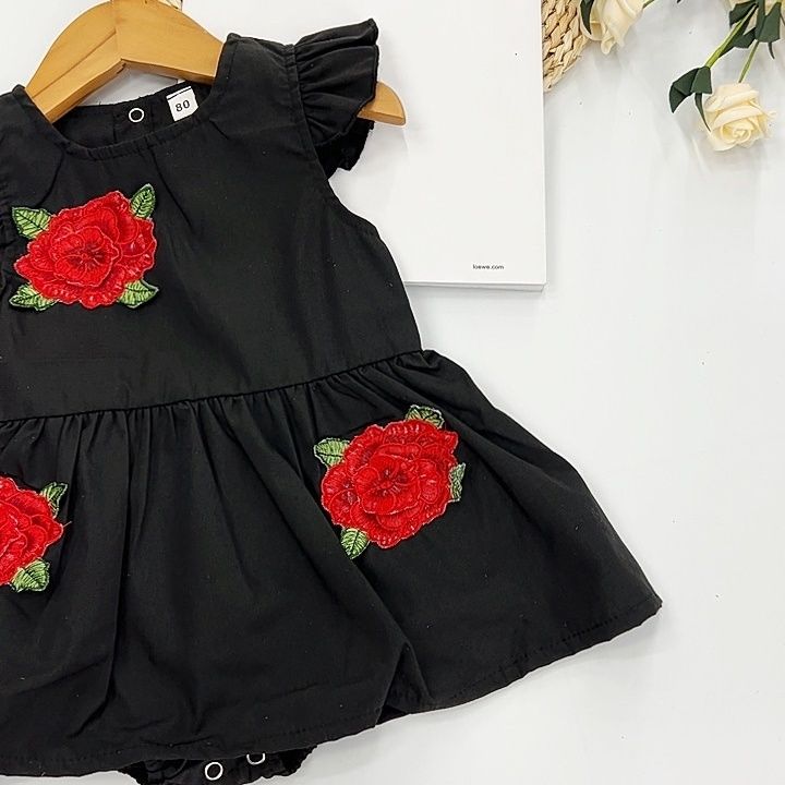 Charming, elegant, and perfect — this Rosie Bloom Dress is a must-have for your little one’s wardrobe. Designed in a classic black base with vibrant red rose appliqués, it brings a touch of sophistication to everyday wear. The flutter ruffle sleeves and soft cotton blend fabric make it both stylish and comfortable, ideal for parties, family gatherings, or adorable photoshoots.