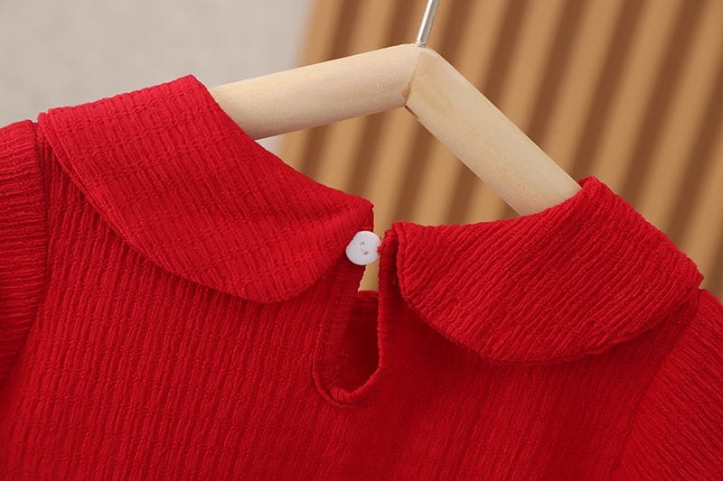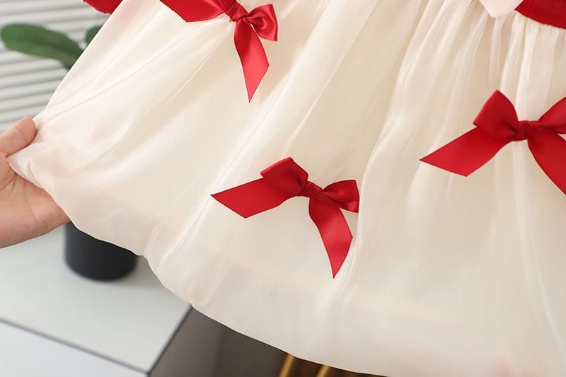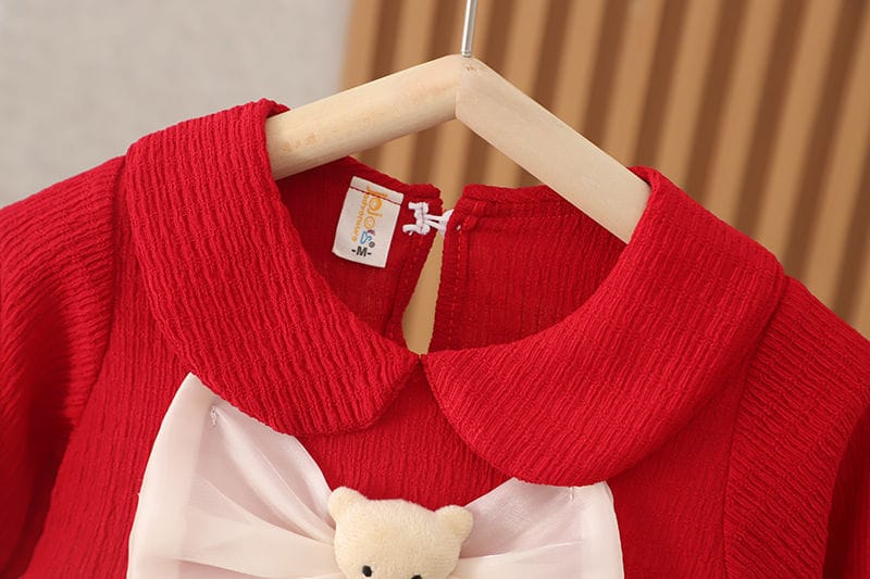 Sweet, stylish, and perfect for special occasions — the Teddy Bow Princess Frock is designed to make your little girl stand out. With a bright red knitted bodice and a shimmery white-gold frill skirt, this frock blends comfort with elegance. The large chiffon bow at the waist, adorned with a tiny teddy bear, along with three red satin bows, gives it a playful yet regal charm.